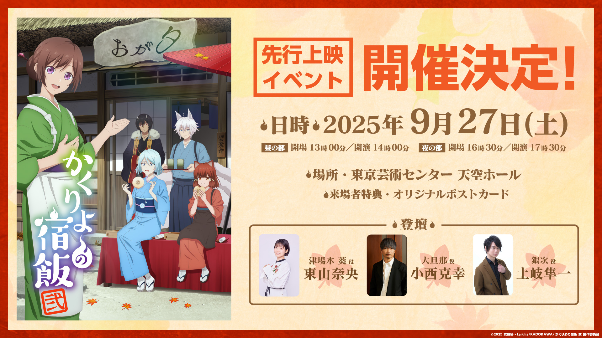 TVアニメ「かくりよの宿飯 弐」の先行上映イベントを、2025年9月27日(土)に東京芸術センター 天空劇場(東京都足立区)にて開催いたします!